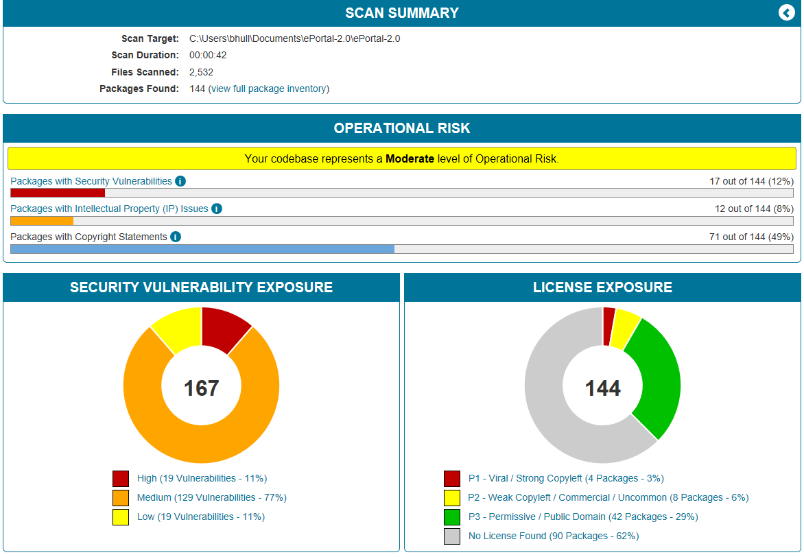 | • | Security Vulnerability Exposure and License Exposure—These sections provide a breakdown of the types and categories of identified issues. |