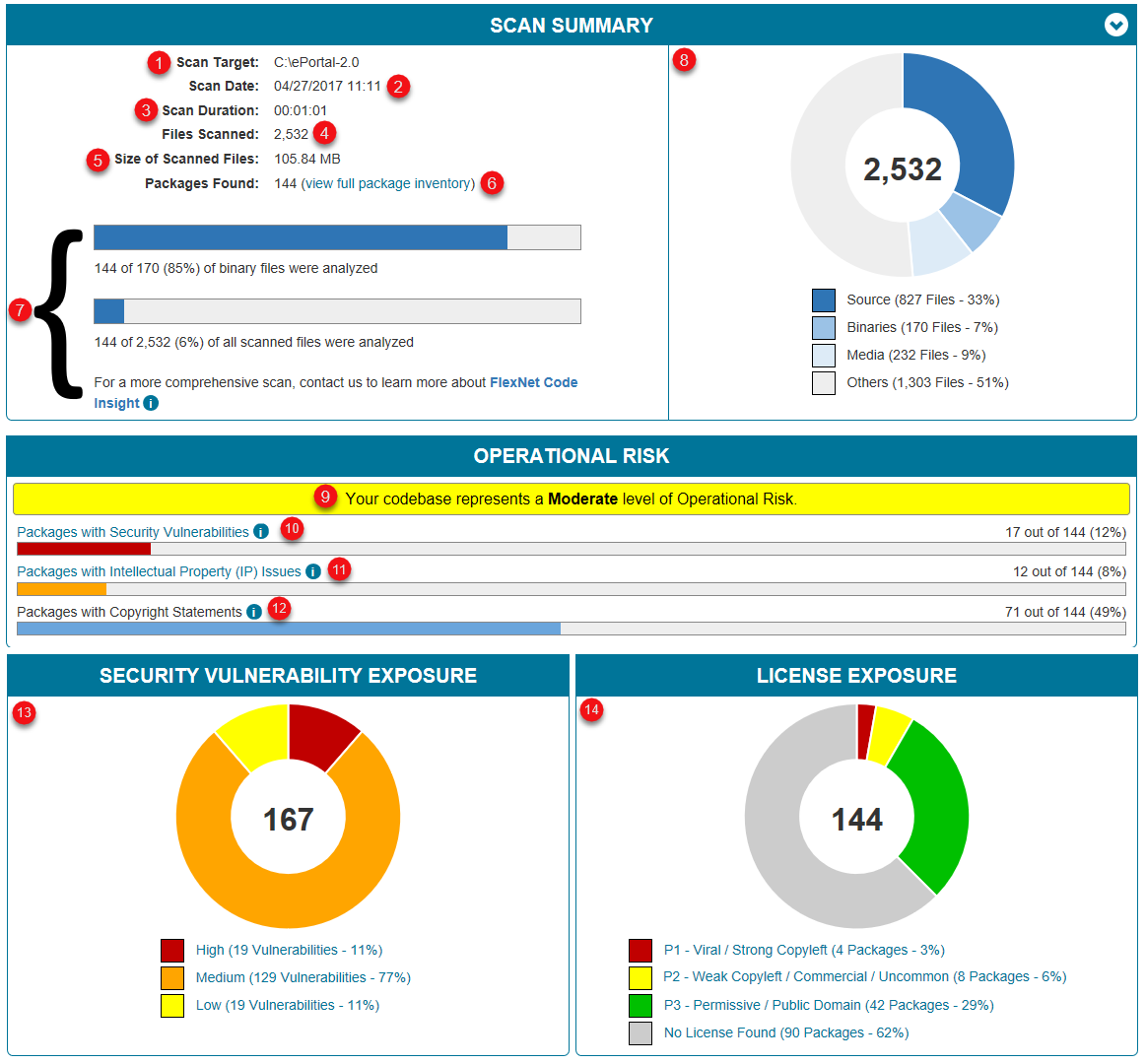 (Not visible unless the Expand arrow is clicked) Together these two graphs provide a visual representation of the total scan. The graph in 7 shows the percentage of files analyzed. In this example, 143 of 2,532 files, or about 6%, were analyzed. The graph in 8 shows the types of files that comprise the total number of files. The number in the center is the total number of files scanned. FlexNet Code Aware breaks these files into the following categories: