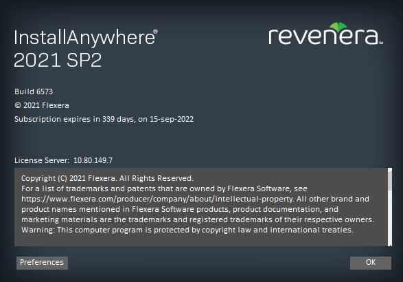 The About InstallAnywhere dialog box for Concurrent subscription license:
