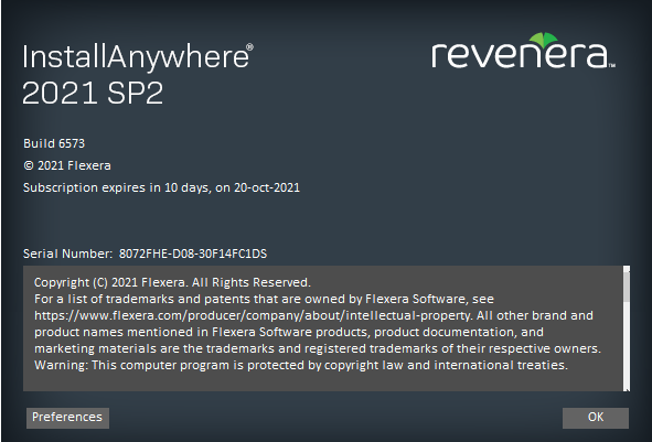 InstallAnywhere updates the subscription details in the About dialog box for all kind of subscription licensing. On the Help menu, click About InstallAnywhere. The About InstallAnywhere dialog box opens and shows the Subscription details after the activation. The About InstallAnywhere dialog box shows the subscription end date and the remaining days left for the current subscription.