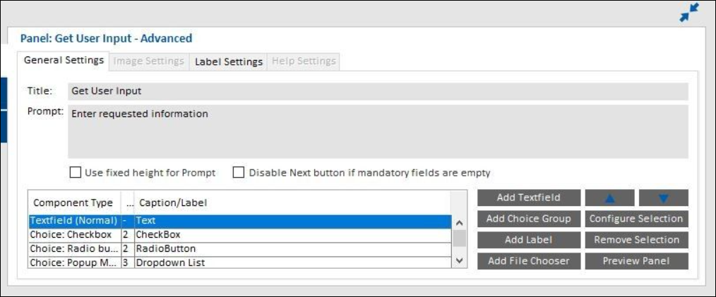| • | When checked, the Next button in the Get User Input panel would be disabled until user enters a value in the mandatory text field. |