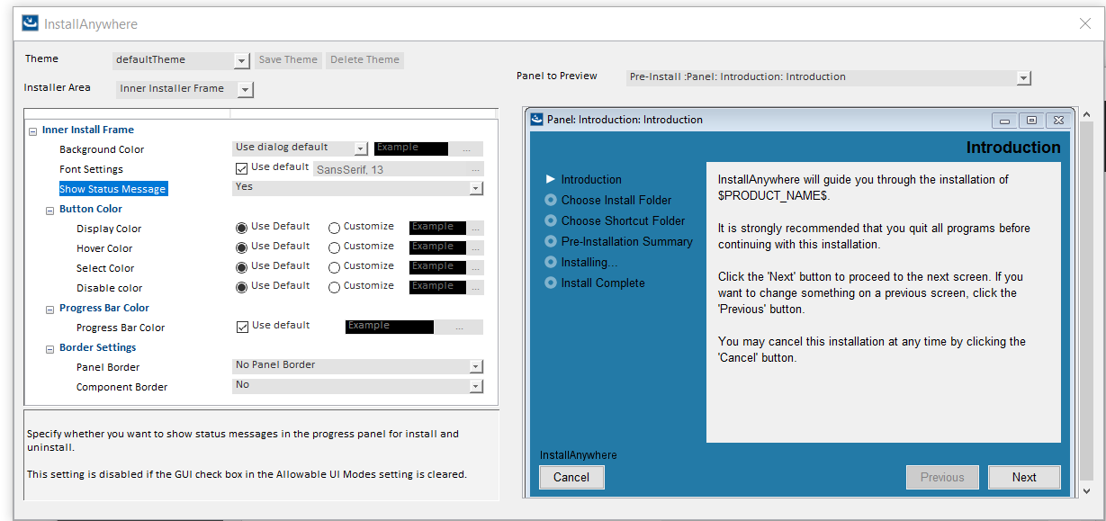 Enhanced InstallAnywhere to configure whether actions should display status messages in Install & Uninstall progress panels or not. A new project property "Show Status Message" has been added in Installer UI > Custom UI Designer > Inner Install Frame for controlling status message. By default, this option is set to "Yes". If this option is set to "No", status messages will not be displayed above the progress bar on the Progress Panel during Install & Uninstall.