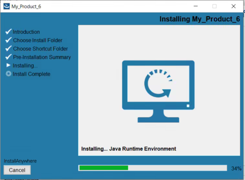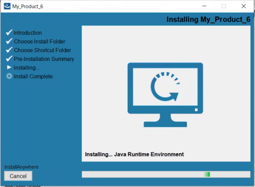 In InstallAnywhere 2022 R2, you have the option of displaying an “indeterminate progress bar” that indicates that installer is running but does not show the percentage of progress. The following is an example of an indeterminate progress bar: