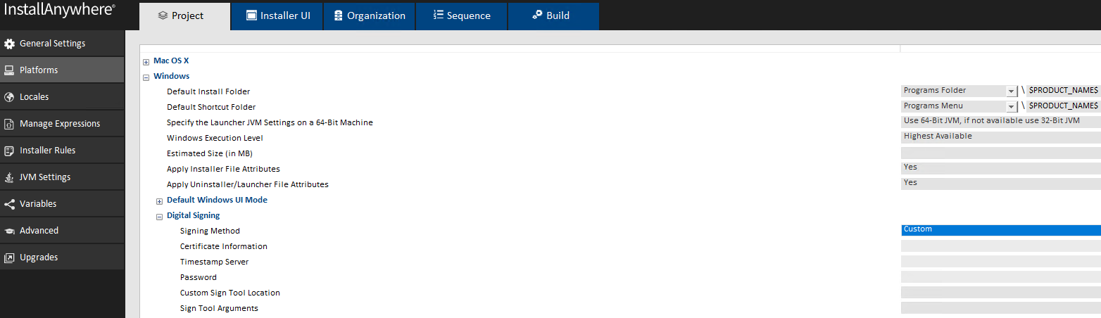 InstallAnywhere 2024 R1 introduces new signing type settings that enable you to select and configure a custom signing solution to digitally sign your Windows-based installers (installer .exe file, installer launcher, and uninstaller launcher) during build time. If the user prefers to use the custom signing solution instead of the InstallAnywhere standard solution, these settings are essential.