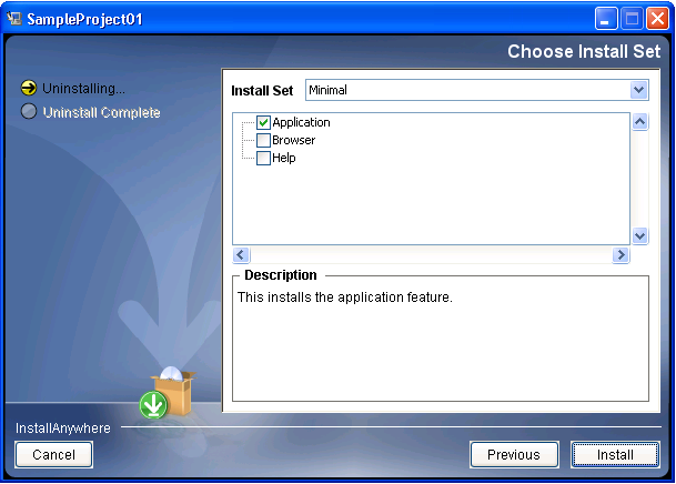 If the end user selects the Add Features option on the Maintenance Mode panel and clicks Next, the maintenance mode run time displays the Choose Install Set panel. The Choose Install Set panel displays the features that are already installed and allows the selection of only the ones that are not yet installed.