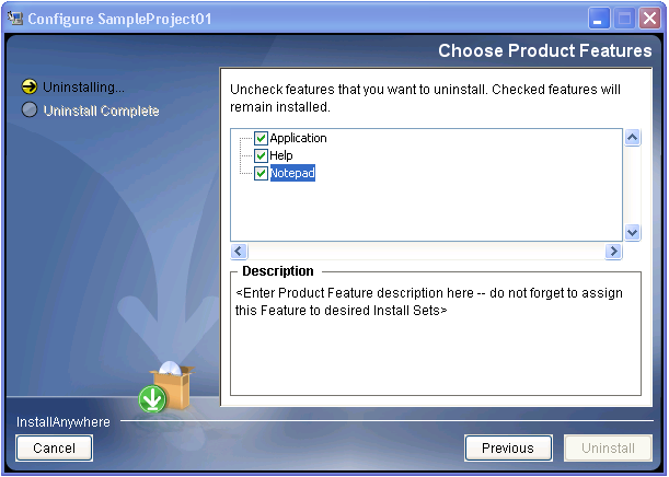 If the end user selects the Remove Features option on the Maintenance Mode panel and clicks Next, the maintenance mode run time displays the Choose Product Features panel. The Choose Product Features panel displays the features that are installed and allows the end user to deselect the ones that need to be uninstalled.