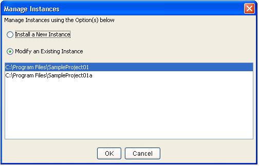 If multiple instances of a product are installed on the same machine when the end user launches maintenance mode, the Manage Instances dialog box opens. This dialog box prompts end users to either choose to install a new instance or select the instance that they want to modify.