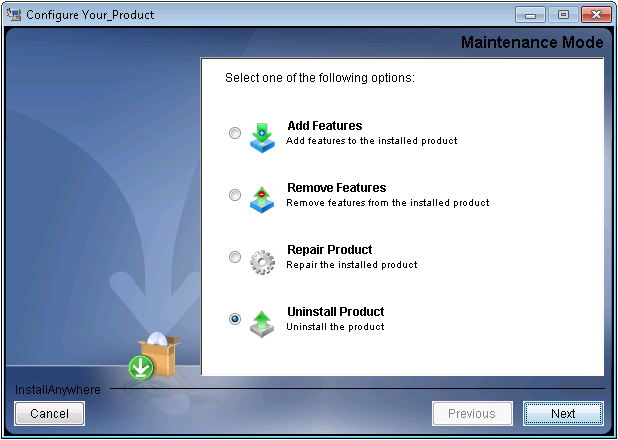 If the end user selects the Uninstall Product option on the Maintenance Mode panel and clicks Next, the maintenance mode run time displays the panels in the Pre-Uninstallation action group in the Pre-Uninstall sequence and proceeds as a regular uninstallation.
