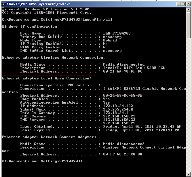 | 3. | In the Ethernet adapter Local Area Connection section, look at the Physical Address value. |