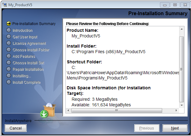 | • | Disk space is governed by the user installation directory ($USER_INSTALL_DIR$ and Choose Folder action) and the chosen install set ($CHOSEN_INSTALL_SET$ and Choose Install Set action). |