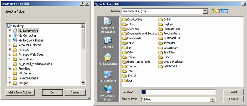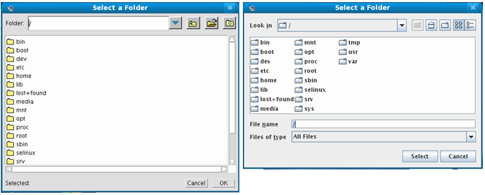 The following images illustrate the differences between the Browse for Folder dialog box that is rendered with native resources versus one that is rendered with Swing resources on Windows-based and Linux-based systems.