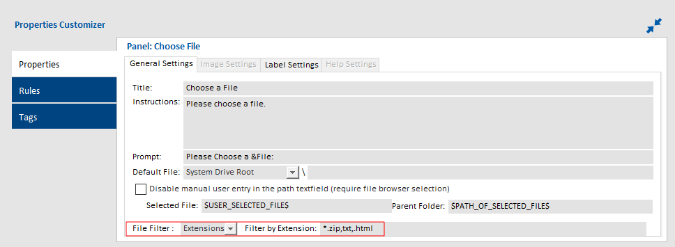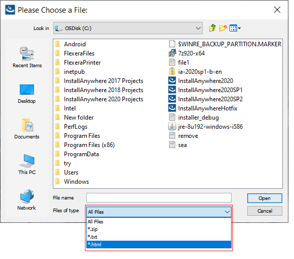 The Choose File panel action lets end users select a file; it uses the file name and the path to the file as the values of InstallAnywhere standard variables. You can use these variables elsewhere in your installer. Additionally, you can configure the Choose File panel to filter the files by specific type. The configurable filter options are: