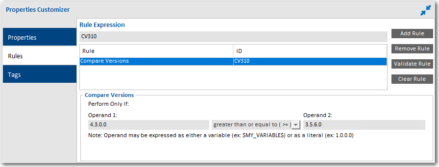 When you add a Compare Versions rule, you are prompted to enter two operands and an operator in the Compare Versions Properties Customizer. Both operands may be expressed as either an InstallAnywhere variable being resolved (such as $VARIABLE1$) or as a literal version number string (such as 1.0.0.0).