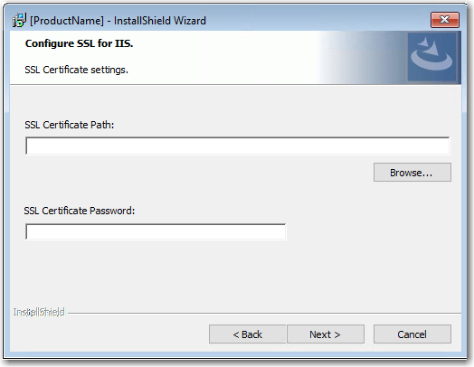 The property name for the SSL Certificate and password configured by the user is required to update in the IISBrowseSSLCertificate dialog for the Edit boxes (IISWebCertPassword and IISWebCertPath) and the push button (BrowseCertificate) events.