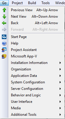 The following table lists the Go menu commands, as well as associated keyboard shortcuts and icons. Some of the view-related commands are not available from the Go menu, depending on which project type you have open in InstallShield.