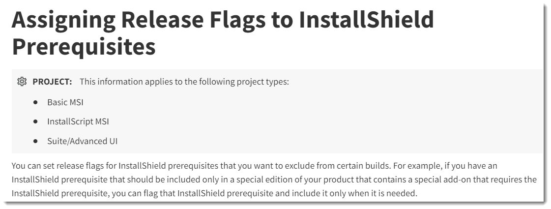 Note:Topics in the InstallShield Help Library that can be filtered by Project Type have a PROJECT note at the top indicating which Project Types the topic applies to.