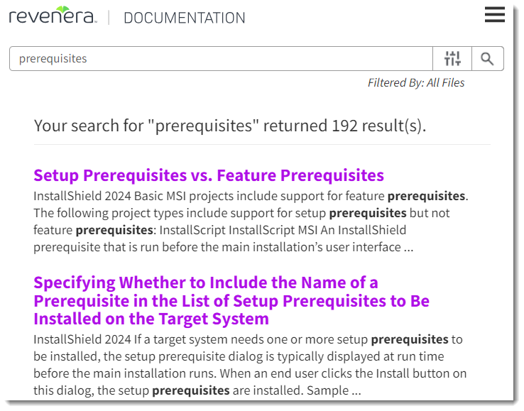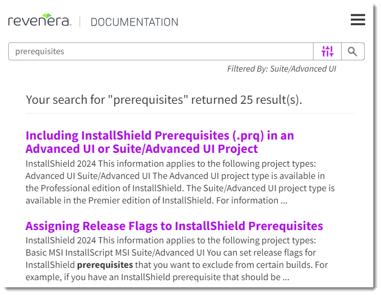 Starting with InstallShield 2024, you can now filter search results by Project Type when viewing the InstallShield Help Library on docs.revenera.com.