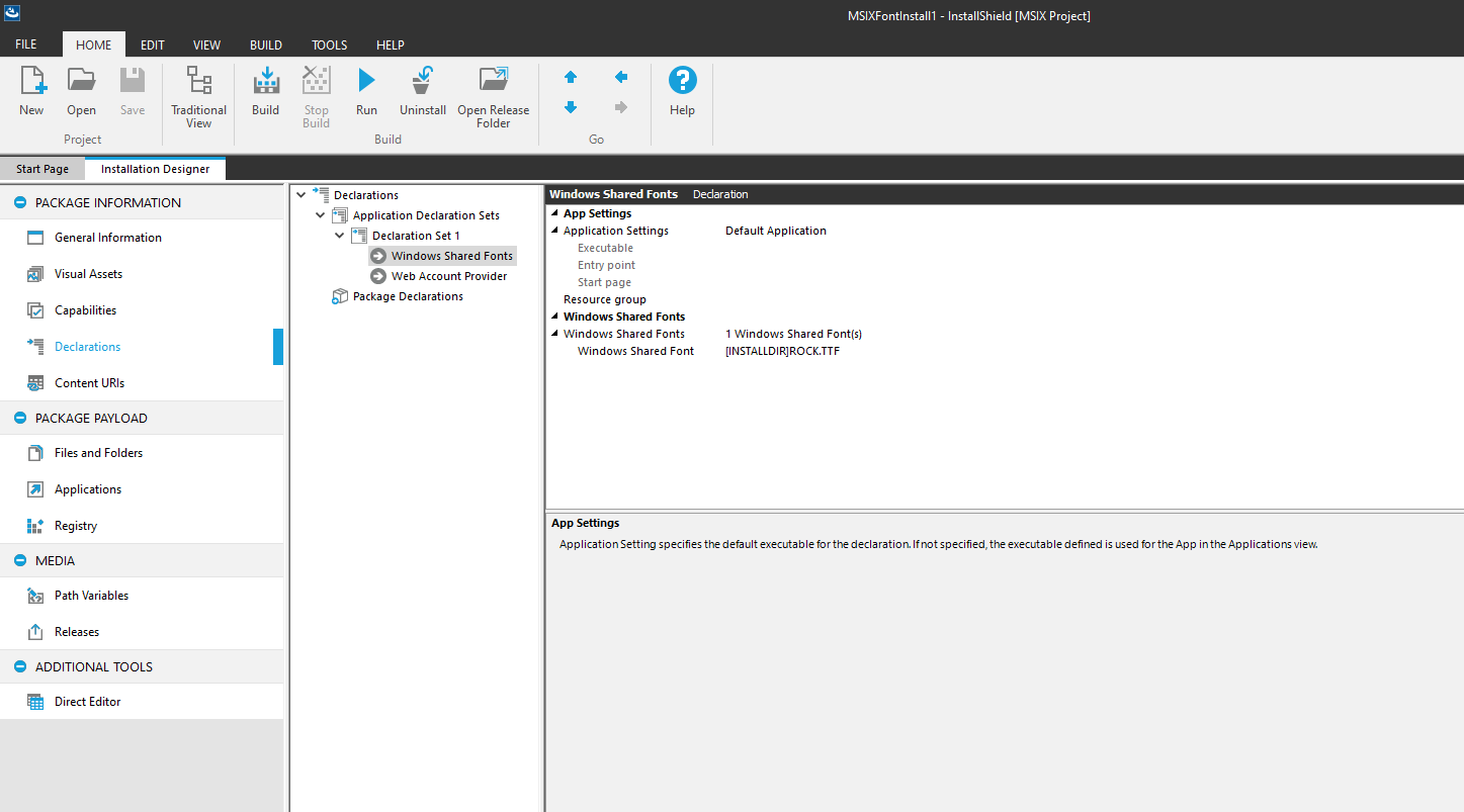 Installshield supports “Windows Shared Fonts” declaration for MSIX project. This declaration can be added to MSIX project from the “Declaration” view to install and share the custom fonts with other applications in the system.