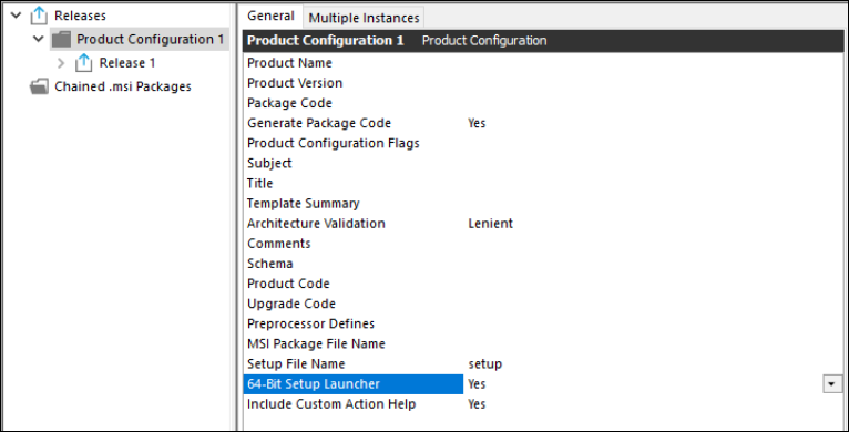 | 1. | To create a Pure 64-Bit Installer in the Basic MSI project, navigate to the Product Configuration view and select 64-Bit Setup Launcher. |