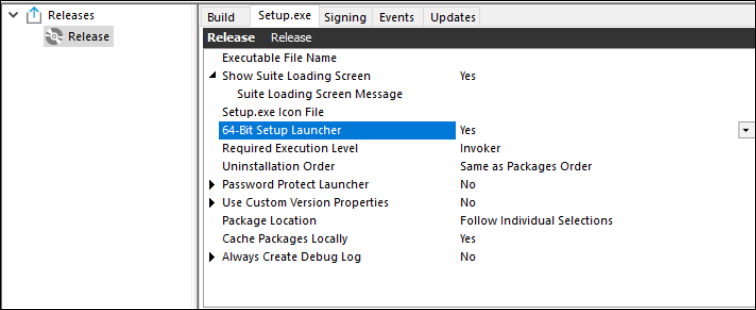 | 2. | To create a Pure 64-Bit Installer in the Suite project, navigate to the Releases view and select 64-Bit Setup Launcher. |