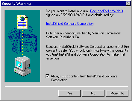 When end users download your application, a digital certificate is displayed. The digital certificate is a panel that informs end users when your application was signed and asks if they want to download and run your application. End users click OK to accept your application package.
