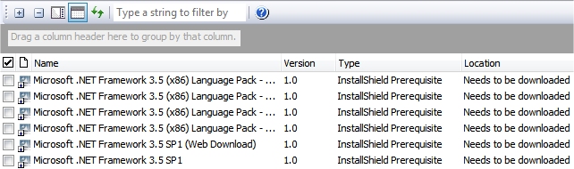 If you press CTRL while dragging and dropping one column header onto the group box, InstallShield arranges the rows in the grid into groups of items. The following screen shot shows part of the Redistributables view. Rows are organized to help identify the redistributables that have been added to the project (that is, the redistributables whose check box is selected).