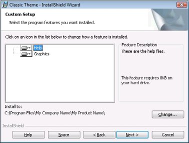 The Custom Setup dialog is displayed only when a user selects the Custom Setup setup type. Therefore, in order to include this dialog in your setup, you must allow custom setups in the Setup Types view. In this dialog, end users can choose which features they want to install. This dialog can also display the target destination for your setup and provide functionality for changing that destination.