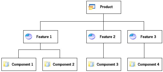 An installation is divided into three levels: products, features, and components. The following diagram illustrates this hierarchy:
