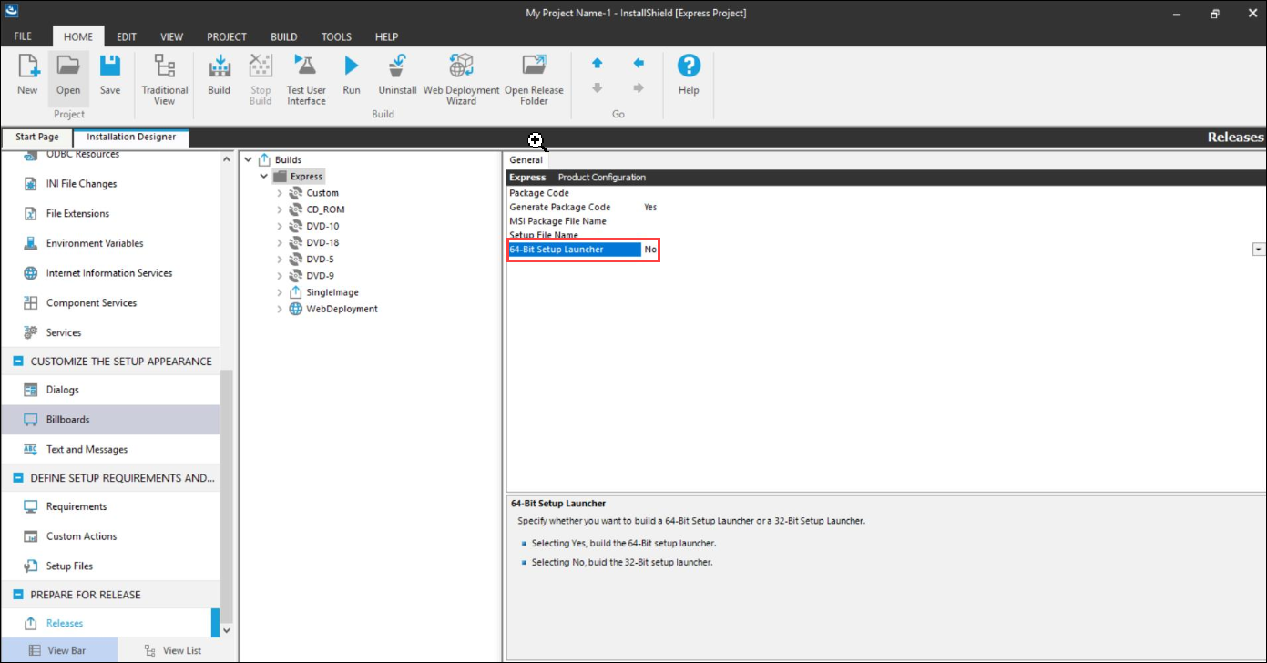 To create a Pure 64-Bit Installer, navigate to the Product Configuration view and set the 64-Bit Setup Launcher property to Yes.