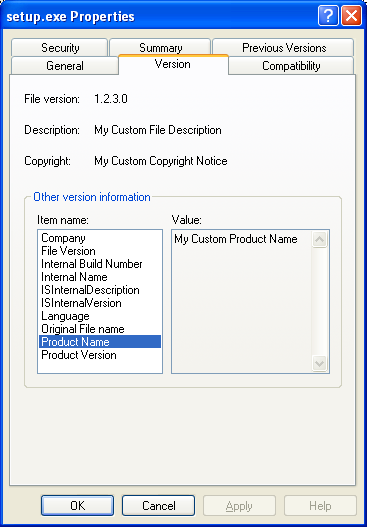 InstallShield lets you use custom information for the version resources of the Setup.exe setup launcher. The information is displayed on the Properties dialog box for the setup launcher; this Properties dialog box opens when end users right-click the Setup.exe file and then click Properties.